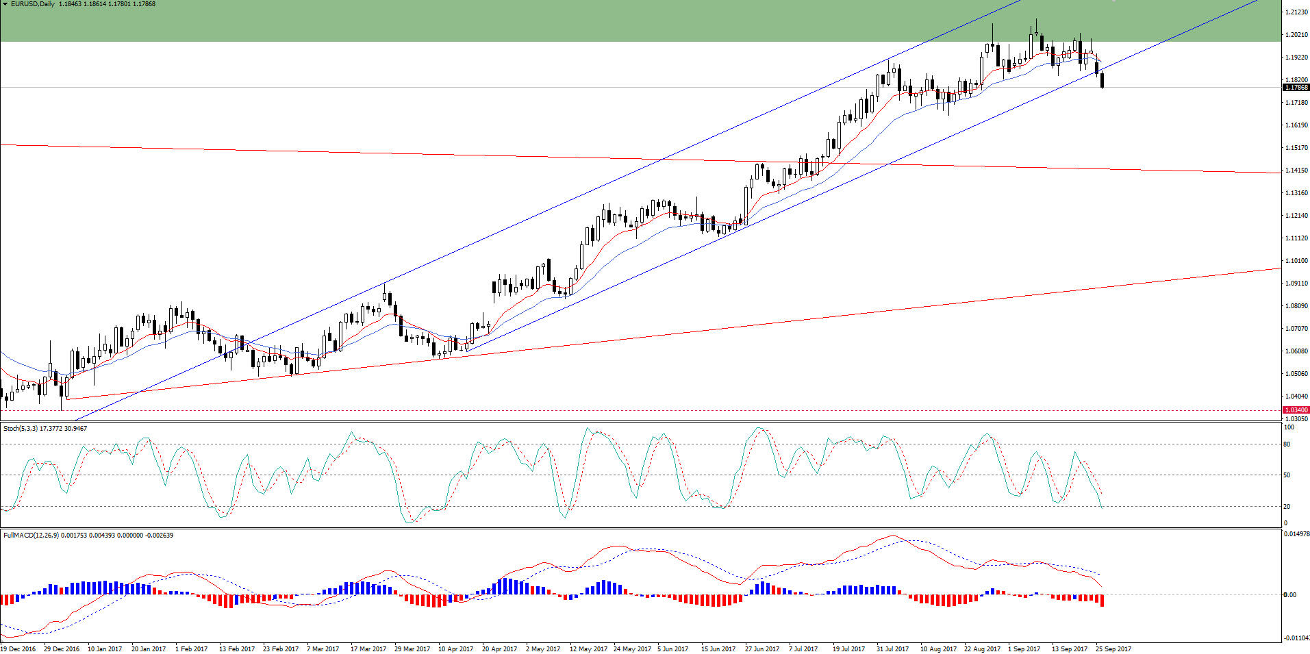 Ao observarmos o gráfico mensal, o par chegou a uma região que foi suporte por bastante tempo, e que neste momento ofereceu resistência, a área 1.20 a 1.21. E culminando com a potencial região de resistência, essas eleições complicadas para o governo alemão, o que aumentou a efetividade de resistência da região em verde como podemos ver no gráfico a seguir: