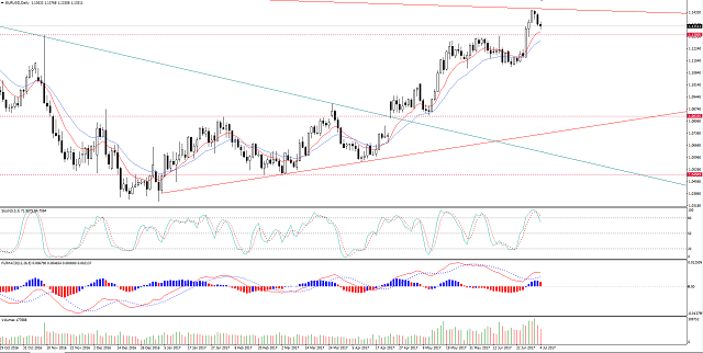 Ao que parece ainda há espaço para uma retração um pouco maior, em velas horárias vemos que as EMAs estão cruzadas para baixo, claramente mostrando o momento de retração, em velas diárias o estocástico está saindo do sobrecomprado com essa retração, o MACD e as médias móveis indicam a tendência de alta, não parece provável que o preço consiga cair muito abaixo do 1.13.
