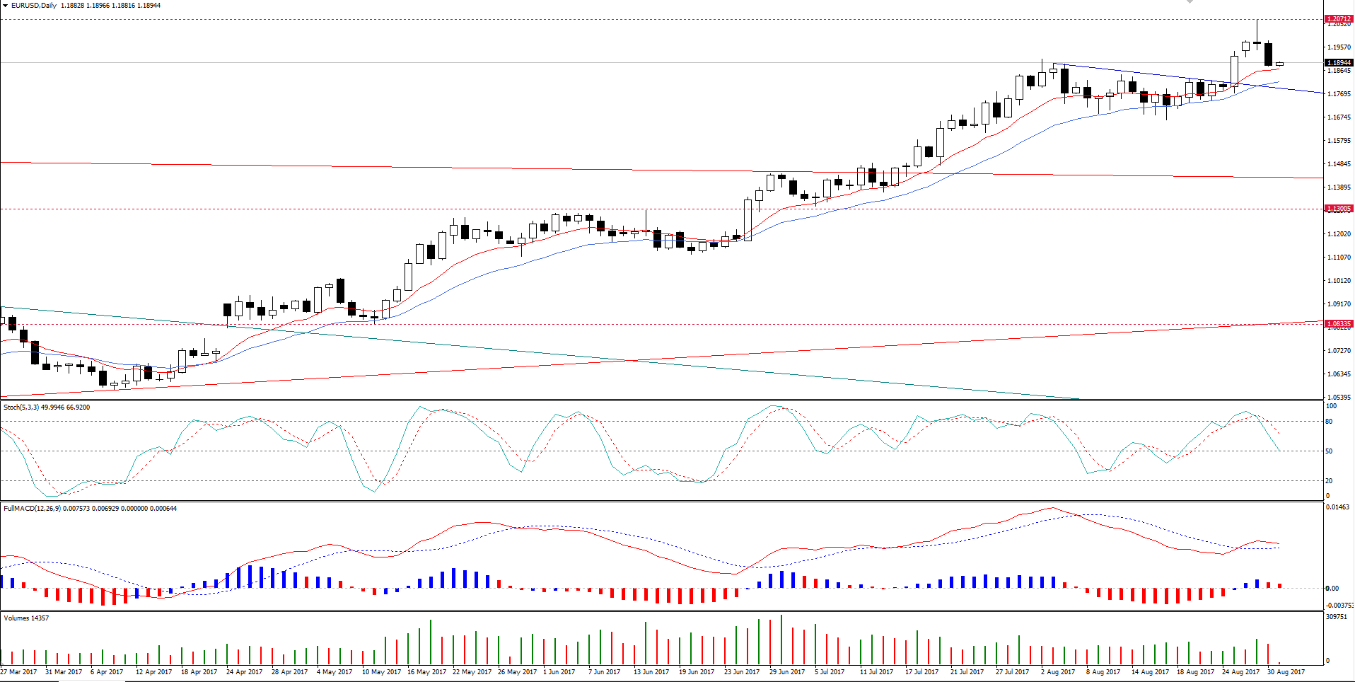 Analisando tecnicamente o EURUSD, podemos ver que a EMA10 (vermelha) está acima da EMA20 (azul) indicando a tendência de alta. O MACD está maior que a linha de equilíbrio, também sugerindo o momento de alta no preço, o estocástico está apontando para baixo, mostrando a retração ocorrida nos últimos dias. De formar geral, a tendência é de alta, porém antes da alta ser retomada o preço ainda poderá ter uma retração maior.