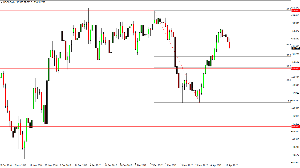 O mercado do Brent tentou, inicialmente, fazer um rally, durante o dia de Quarta-feira, mas encontrou o nível dos $55, de longe, demasiado resistente. Mesmo que a estimativa corresponde àquilo que o mercado esperou, aquilo que causou um pouco mais de problema são os crescentes inventários da gasolina. Isto mostra que abaixo da linha, nós podemos ter falta de procura de mais petróleo. Isto é, obviamente, bearish para os mercados e poderia conduzir o preço do Brent mais abaixo para o nível dos $53. Eu julgo que os compradores ainda não abandonaram o mercado, apenas fizeram uma pausa. Se nós quebrarmos abaixo do nível dos $53, eu acredito que o mercado procurará depois o patamar dos $50. Alternativamente, algum tipo de vela favorável em sentido ascendente também deveria ser interessante. De qualquer forma, eu julgo que nós vamos ver um pouco de volatilidade.