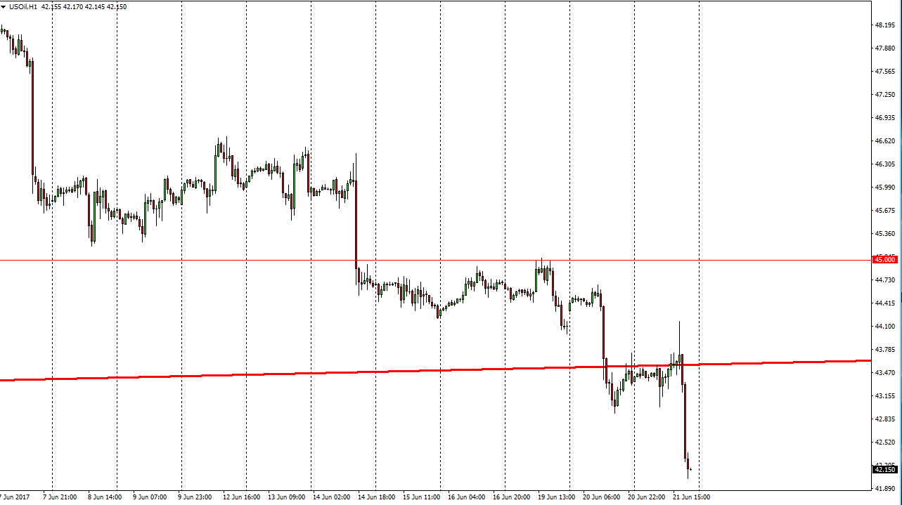O mercado do Petróleo Bruto WTI quebraram, de forma significativa, durante o dia de Quarta-feira, após terem tentado inicialmente fazer um rally. O mercado deslizou ao longo do nível dos $43, rumando a caminho do nível dos $42. Eu julgo que, de cada vez que nós fazemos um rally, tal deverá constituir uma boa oportunidade de venda e, sendo esse o caso, é provável que os vendedores vão regressar novamente. Eu julgo que esse mercado deveria depois avançar para o patamar dos $40, à medida que o mercado do petróleo continua a lutar em geral. Existe um excesso massivo de oferta no mercado e, como tal, faz muito sentido que os vendedores vão continuar a se envolverem. Eu não tenho qualquer interesse em tentar comprar este mercado porque, muito francamente, nós acabámos de ver uma quebra massiva, através de suporte.