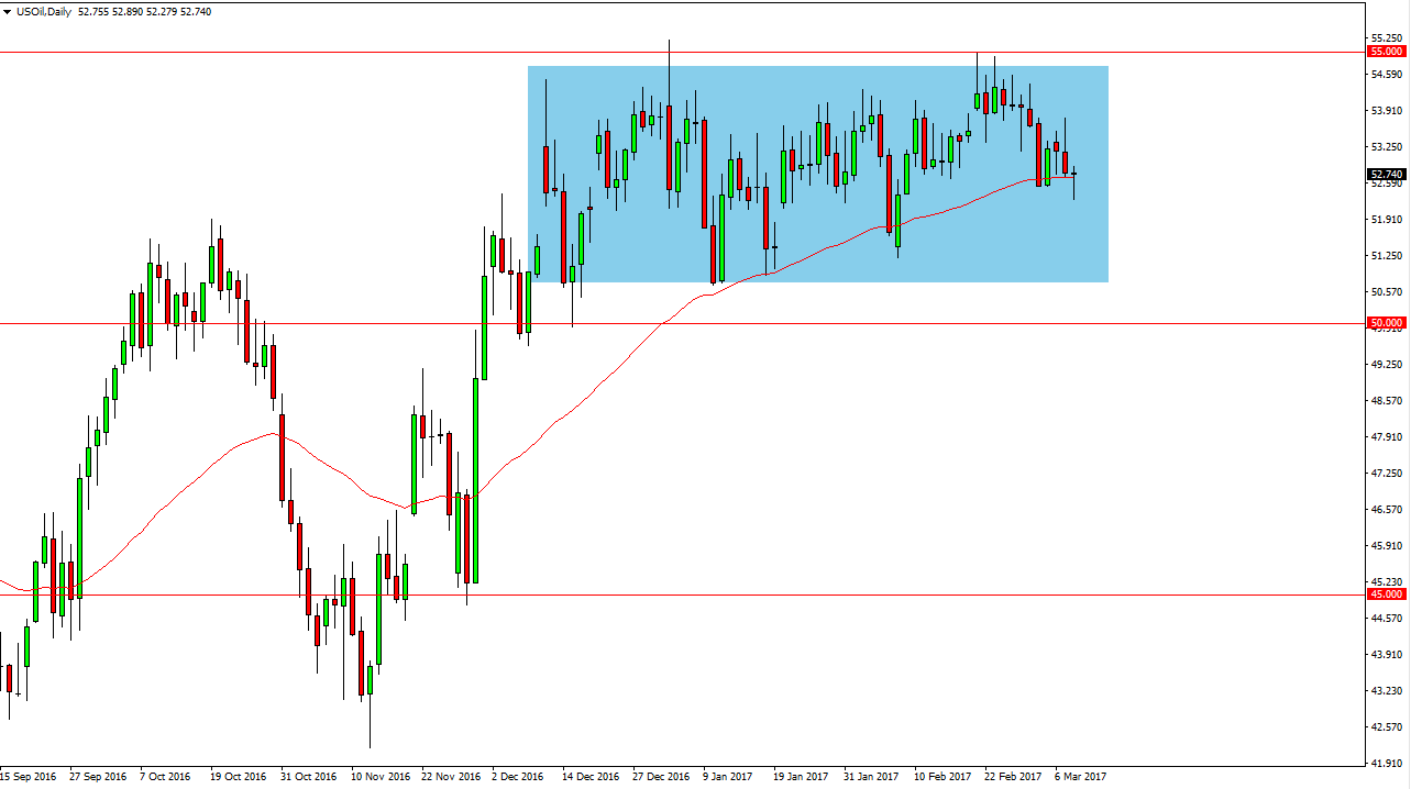 Os Mercados do Brent também caíram durante o dia de Quarta-feira, testando a média da mudança exponencial dos 50 dias para suporte e, obviamente, o nível dos $55. Nós ressaltámos o suficiente para formar um martelo, mas nós temos uma estrela cadente logo acima. Se nós quebrarmos acima do topo da estrela cadente, isso constituiria um sinal bullish, mas, muito francamente, eu não julgo que tal vá acontecer. Eu julgo que este é mais um tipo de negociação de avanço e retrocesso que nós temos visto ao longo de tanto tempo. Se nós quebrarmos abaixo do nível dos $55, o mercado deveria depois rumar ao nível dos $53.50.