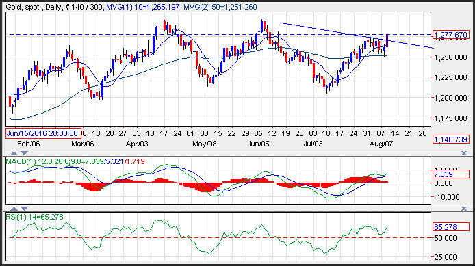 Os preços do ouro eclodiram deslizando ao longo de uma linha de tendência inclinada para baixo e das elevações de Julho em 1.274, o que é visto agora como apoio a curto prazo. A resistência do metal dourado é vista perto das altas de Junho em 1.296. O impulso acelerou mais acima, à medida que o histograma MACD mostra uma trajetória inclinada ascendente que aponta para preços mais elevados para o metal dourado.