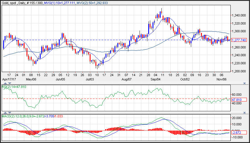 Os preços do ouro consolidaram perto da média de mudança de 10 dias para as laterais à frente dos relatórios CPI de Quarta-feira e as vendas a retalho dos Estados Unidos. A resistência é vista perto da média de mudança de 10 dias em 1.292. O impulso é neutro à medida que o histograma MACD (média de mudança convergência divergência) imprime junto ao nível índice zero com uma trajetória constante que reflete consolidação.
