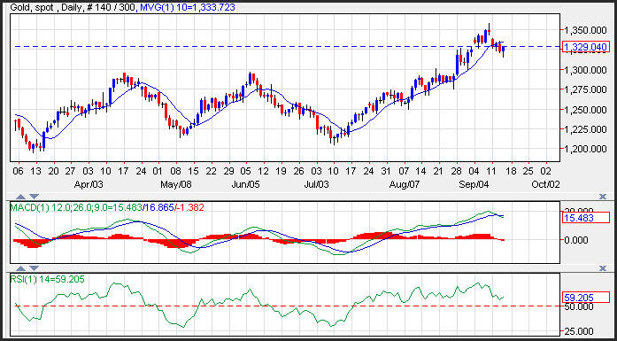 Os preços do ouro recuperaram das baixas da sessão, na quinta-feira, na sequência de um relatório da inflação ao consumidor dos E.U.A., mais forte do que esperado. Os preços fecharam junto das suas altas, mas foram incapazes de recapturar resistência perto da média de mudança de 10 dias em 1.333. Uma quebra deste nível conduziria provavelmente a um regresso às altas de Setembro em 1.357. O suporte é visto junto das baixas do final de Agosto em 1.300. O impulso tornou-se negativo à medida que o índice MACD (média de mudança convergência divergência) gerou um sinal de venda de transição.