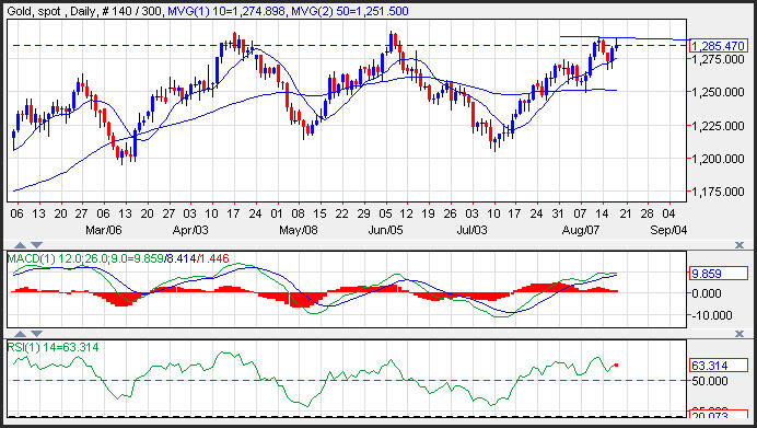 Os preços do ouro aumentaram, mas foram incapazes de pressionar acima da resistência da linha de tendência, apesar de uma inflação mais suave do que esperado e de um BCE e Fed pacifistas. O ouro está prestes a testar as altas de Agosto em 1.292 e em seguida as altas de Agosto em 1.296. O suporte do metal dourado é visto perto da média de mudança de 10 dias em 1.274. O impulso é neutro à medida que o histograma MACD (média de mudança convergência divergência) imprime no negro com uma trajetória constante que reflete consolidação.