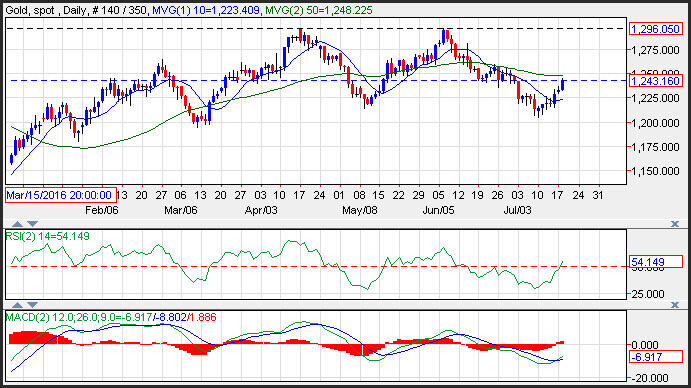 Os preços do ouro continuaram a subir à medida que o dólar desliza, pavimentando o caminho para preços mais elevados do ouro. Os rendimentos nos E.U.A. mudaram-se mais abaixo relativamente aos pares Europeus, pressionando o rendimento diferencial contra o dólar. Os preços quebraram ao longo de uma linha de tendência inclinada descendente e estão preparados para testar o próximo alvo de resistência junto às altas de 25 de Junho, em 1.257. O suporte é visto junto à média de mudança de 10-dias em 1.222. A resistência é vista junto à média de mudança 50-dias em 1.248.