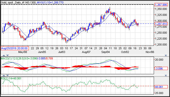 Os preços do ouro recuperaram, na Quinta-feira, à medida que o dólar facilitou e a aversão ao risco reentrou nos mercados, na sequência de um relatório do PIB chinês mais suave do que esperado. Os preços recuperaram em termos de resistência perto da média de mudança de 10 dias em 1.288. O suporte do metal dourado é visto perto das baixas de Outubro em 1.260. O impulso positivo está desacelerando à medida que o historgrama MACD (média de mudança convergência divergência) imprime no negro com uma trajetória de nivelamento que aponta para a consolidação.