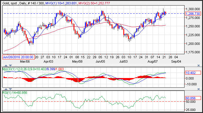Os preços do ouro desceram, na Terça-feira, à medida que o dólar ganhou tração seguindo o relatório de Confiança do Investidor German ZEW, mais suave do que o esperado. O metal dourado gerou um dia interno, com altas inferiores e uma baixa superior que se manteve acima do suporte junto à média de mudança de 10 dias em 1.283. A resistência é vista junto às altas de Agosto em 1.1910. O impulso é neutro mas o impulso positivo sofreu uma desaceleração à medida que o índice MACD (média de mudança convergência divergência) poderia gerar um cruzamento do sinal de venda. O histograma MACD está a imprimir no vermelho com um trajeto inclinado descendente que está a apontar para preços mais baixos.