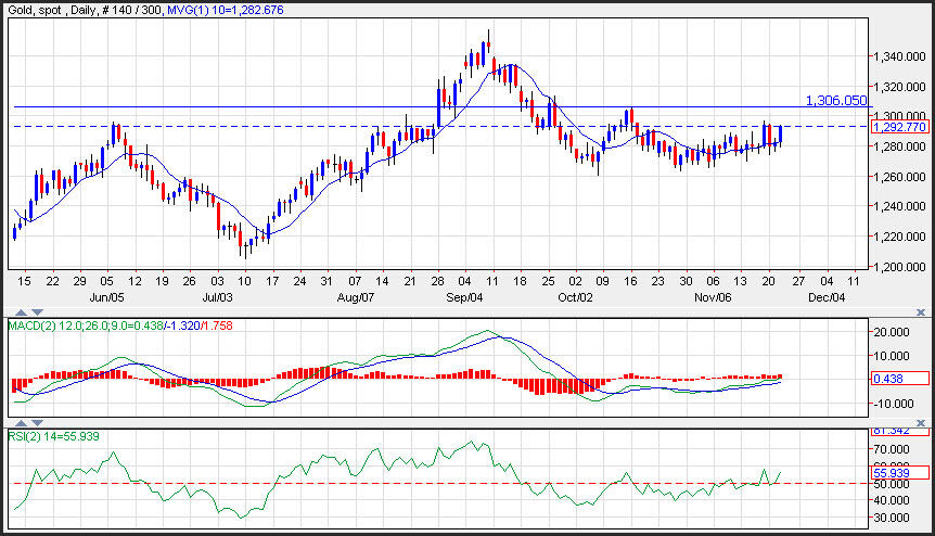 Os preços do ouro aumentaram, na quarta-feira, à medida que o dólar desceu, apesar do relatório do desemprego mais forte do que o esperado que relatou que foi compensado pelas decepcionantes Encomendas de Bens Duráveis dos E.U.A. Os preços estão testando as altas desta semana em 1.293 e depois teriam como alvo as elevações de outubro em 1.306. O suporte é visto perto da média de mudança de 10 dias em 1.282. O impulso está a aumentar, com a impressão de histograma MACD no negro com uma trajetória ligeiramente positiva.