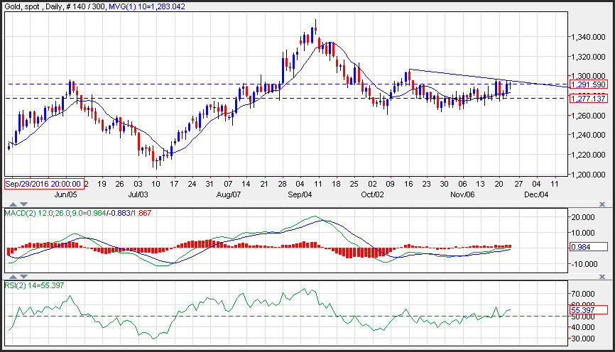 Os preços do ouro aumentaram mais à medida que o Euro ganhou tração, na sequência dos dados do PMI alemão e francês mais fortes do que o esperado. Os preços descansaram na resistência perto de uma linha de tendência descendente inclinada que surge próximo de 1.292. Uma pausa deste nível conduziria a um teste das elevações de outubro em 1.306. O suporte é visto perto da média de mudança de 10 dias em 1.283.