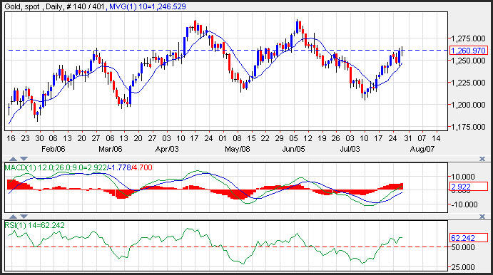 Os preços do ouro formaram um dia doji que é um dos indecisos à medida que os preços conduziram as forças conflituantes. Apesar de as ações terem caído e gerado medo a curto prazo, o dólar ganhou tração, na sequência de um relatório dos bens duradouros dos E.U.A. mais forte do que esperado. Os preços mantêm-se numa tendência ascendente a curto prazo com resistência junto às altas de Junho em 1.296. O suporte do metal dourado é visto junto à média de mudança de 10 dias em 1.246. O impulso mantém-se positivo à medida que o histograma MACD (média de mudança convergência divergência) imprime no negro com uma trajetória inclinada ascendente que aponta para preços mais elevados.