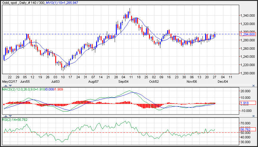 Os preços do ouro atingiram uma alta de 6 semanas na segunda-feira e está a pressionar em direção à resistência perto das elevações de outubro em 1.306. Uma pausa deste nível pode levar a um teste das elevações de setembro em 1.349. Os preços do ouro estão negociando para as laterais, à medida que a força do dólar está limitando em sentido ascendente para os ganhos do preço. O Euro tem feito progressos recentes, mas a força do dólar face ao iene manteve o valor do dólar face aos preços do ouro. Desde que o ouro fixou o preço em dólar, um dólar mais forte encarece o ouro noutras moedas.