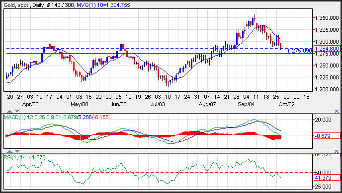 O ouro quebrou e está preparado para testar o suporte perto das baixas de 24 de Agosto em 1.275. A resistência do metal dourado é vista perto da média de mudança de 10 dias em 1.304. O impulso mantém-se negativo à medida que o histograma MACD (média de mudança convergência divergência) imprime no negro com uma trajetória inclinada descendente que aponta para preços mais baixos do metal dourado. O RSI (índice de força relativa) também quebrou, refletindo a aceleração do impulso negativo.