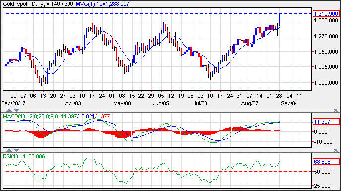 Os preços do ouro quebraram surgindo acima da resistência junto a 1.300 e posicionaram-se para atingir a resistência alvo junto às altas do dia da Eleição Presidencial, de 6 de Novembro de 2016, dos E.U.A. em 1.337. O suporte é visto junto da resistência em 1.300. Os mísseis da Coreia do Norte no fim de semana, ajudaram a fazer boiar o valor do metal dourado. O impuldo tornou-se positivo à medida que o índice MACD (média de mudança convergência divergência) gerou um sinal de compra de transição. O histograma MACD está a imprimir no negro com um trajeto inclinado ascendente que aponta para preços mais elevados.