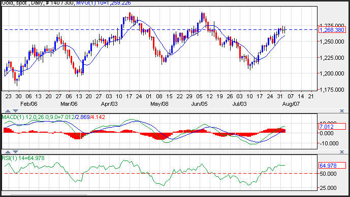 Os preços do ouro formaram um dia doji, pelo segundo dia consecutivo, o que reflete a indecisão dos participantes do mercado. Os preços permanecem numa tendência a curto prazo com suporte visto junto à média de mudança de 10 dias em 1.268. A resistência é vista perto das elevações de Junho em 1.296. A inflação mais suave do que o esperado na Europa ajudou a limitar o ouro em sentido ascendente, apesar de um rally contínuo no EUR/USD. O impulso positivo está a desacelerar à medida que o histograma MACD (média de mudança convergência divergência) imprime no negro com uma trajetória inclinada descendente que aponta para consolidação.