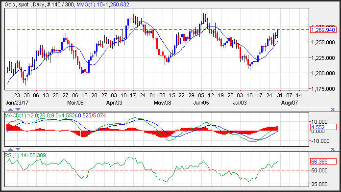 Os preços do ouro aumentaram, na Sexta-feira, à medida que o dólar continuou a retrair, pavimentando o caminho para preços mais elevados do ouro. Mais elevados do que esperado, os dados da inflação, lançados na Europa e no Japão, fizeram flutuar os rendimentos Europeus e Japoneses e elevaram o Euro e o Iene face ao dólar. A resistência é vista junto às altas de Junho em 1,294. O suporte é visto junto da média de mudança de 10 dias em 1,235. O impulso positivo mantém-se positivo, já que as impressões do histograma MACD (média de mudança convergência divergência) ficaram no negro, com uma trajetória ascendente inclinada.