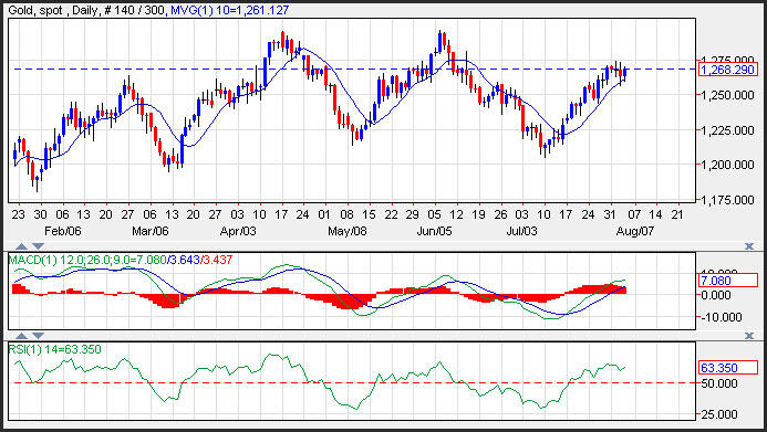 Os preços do ouro subiram, saltando para fora do suporte junto à média de mudança de 10 dias em 1.261. O boletim do BCE mostra que o BCE acredita que a acomodação monetária será necessária, mas as condições de financiamento favoráveis foram positivas, o que estimulou o Euro. A resistência do metal dourado é vista perto as elevações de Junho em 1.296. O impulso positivo está a desacelerar à medida que o histograma MACD (média de mudança convergência divergência) imprime no negro com uma trajetória descendente que aponta para consolidação.
