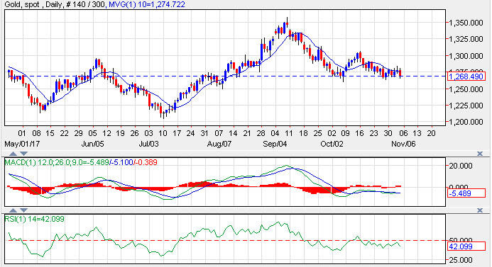 Os preços do ouro desceram, na Sexta-feira, à medida que o dólar ganhou tração, na sequência dos dados dos serviços, mais fortes do que o esperado, reportados pelo ISM. Os preços foram rejeitados perto de resistência da média de mudança de 10 dias em 1.274, com o suporte visto perto das baixas de Outubro em 1.260. O impulso é neutro, à medida que o histograma MACD (média de mudança convergência divergência) imprime perto do nível zero com uma trajetória plana que reflete a consolidação.