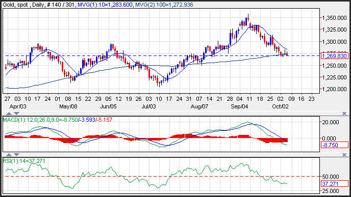 Os preços do ouro estiveram sob pressão, na quinta-feira, à medida que o dólar ganhou tração seguindo um relatório do desemprego dos E.U.A. mais forte que o esperado. Um dólar mais forte é negativo para o ouro que seja cotado em dólar. Os preços estão deslizando ao longo do suporte perto da média de mudança de 100 dias em 1.272 e posicionou-se para testar as baixas de 7 de Agosto em 1.249. A resistência acima da média de mudança de 100 dias é vista perto da média de mudança de 10 dias em 1.283.