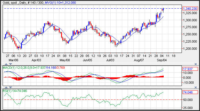 Os preços do ouro aumentaram, na sequência de detonação de bomba de hidrogénio, deste fim de semana, que trouxe uma aversão ao risco relativamente à negociação e que pavimentou o caminho para o aumento dos preços do ouro. O surto do metal dourado quebrou acima de resistência que foi vista junto da altas de 6 de Novembro de 2016 em 1.337. O suporte ao metal dourado é visto junto da média de mudança de 10 dias em 1.312. O próximo nível de resistência do alvo dos preços do ouro é visto perto das altas de Julho de 2016 em 1.371.