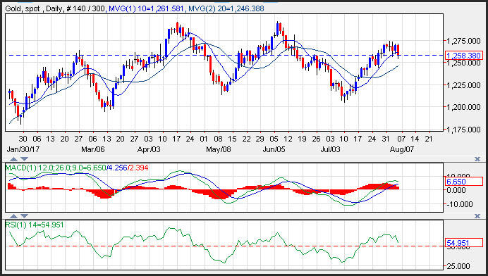 Os preços do ouro moveram-se mais para baixo deslizando ao longo do suporte, junto à média de mudança exponencial de 10 dias, na sequência do relatório das folhas de pagamentos não agrícolas, mais forte do que esperado. Os preços estão agora posicionado para testar o suporte alvo, junto à média de mudança de 20 dias em 1.246. A resistência é vista perto as elevações semanais em 1.275. O impulso positivo está a desacelerar à medida que o histograma MACD (média de mudança convergência divergência) imprime no negro com uma trajetória descendente que aponta para um potencial sinal de cruzamento da venda.