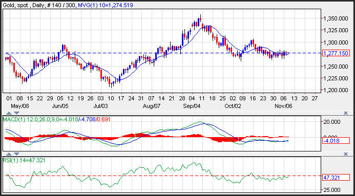 Os preços do ouro estabilizaram à medida que o crédito ao consumidor dos Estados Unidos aumentou em Setembro, mais do que o esperado, o que gera valor em ativos tangíveis, como aumentos de empréstimos. O metal dourado recapturou a média de mudança de 10 dias, que agora é vista como suporte de curto prazo perto de 1.274. A resistência é vista perto das elevações de Outubro em 1.306. O impulso é neutro, à medida que o histograma MACD (média de mudança convergência divergência) imprime perto do nível índice zero com uma trajetória plana que aponta para consolidação.